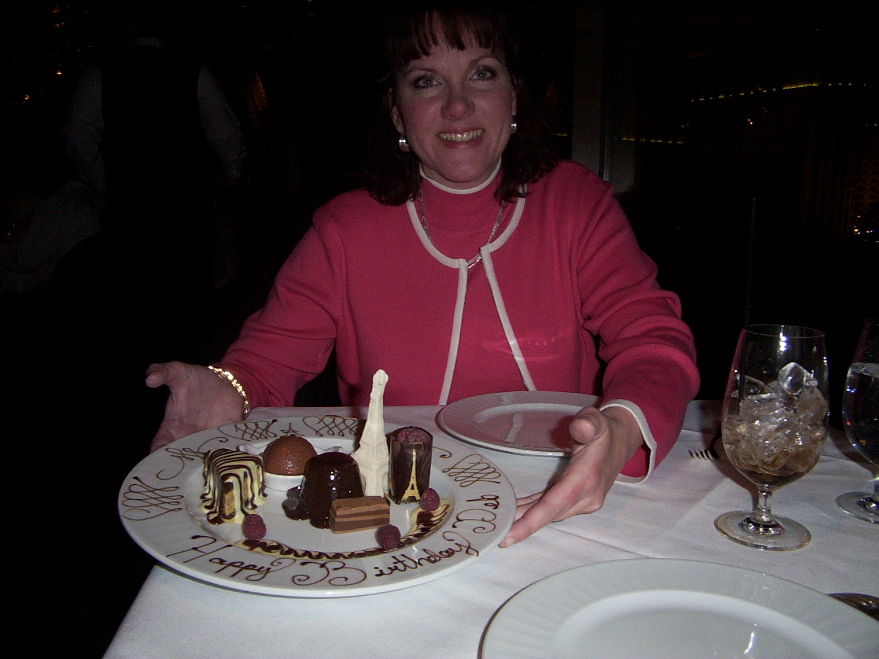 Deb and her birthday desert plate in the Eiffel Tower Restaurant